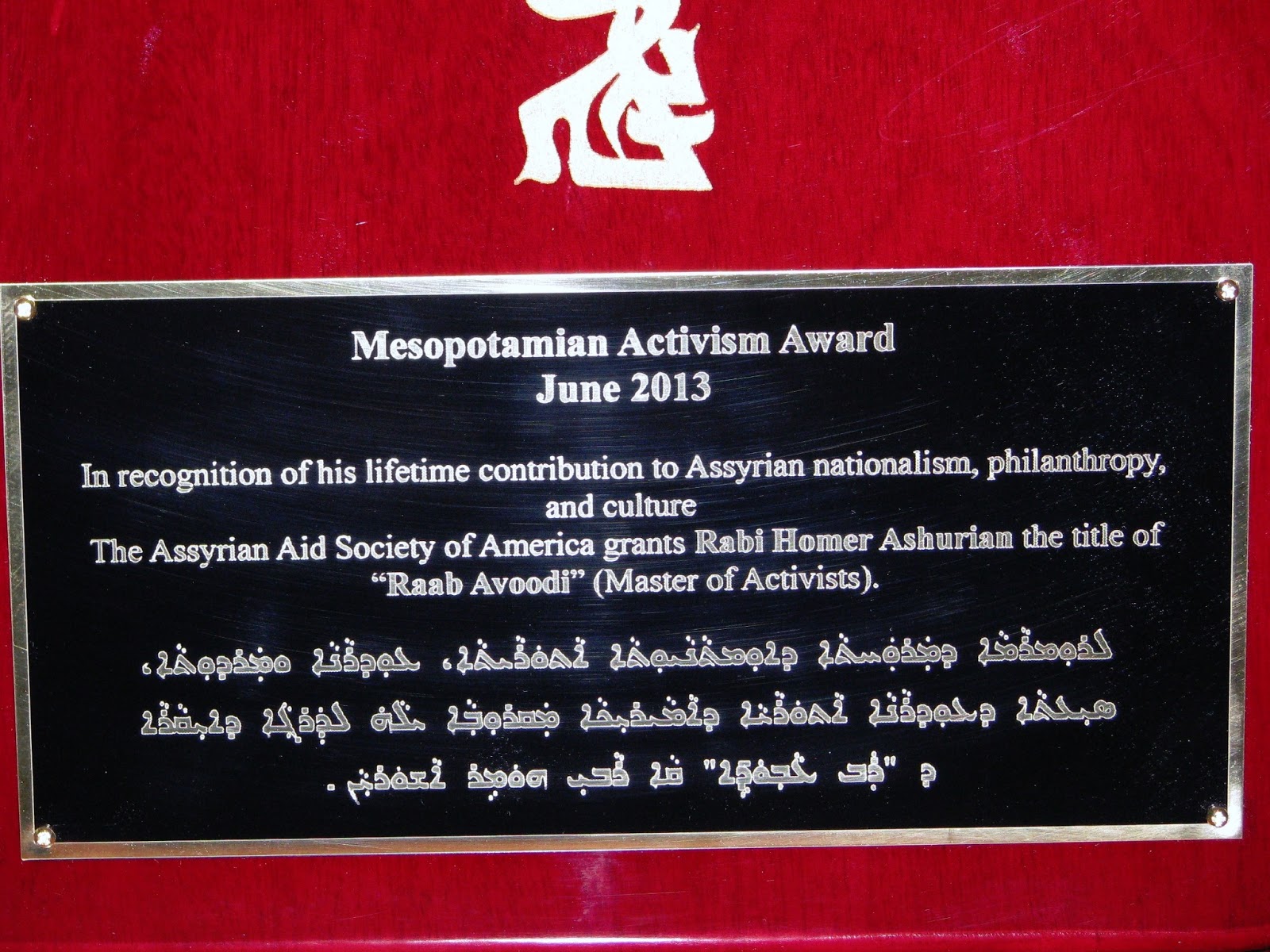 This year, Rabi Homer Ashurian is the recipient of the Mesopotamian Achievement Award in activism with the title “Raab Avoodi/Raab A’woudeh” (Master of Activists) at the 6th Annual Mesopotamian Night.  This award is diligently due his tireless contributions to the advancement of the Assyrian cause, worldwide, in particular, his instrumental role in advancing the Assyrian Universal Alliance Foundation to become one of the largest and most prestigious grassroots Assyrian organizations in the United States.